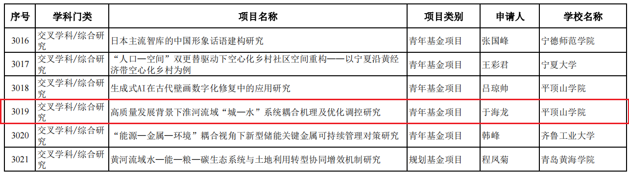 近日,教育部社会科学司公示了2024年度教育部人文社会科学研究一般项目评审结果,威廉希尔足球网于海龙博士主持的青年基金项目“高质量发展背景下淮河流域“城一水”系统耦合机理及优化调控研究”获批立项。这是威廉希尔足球网首次获批教育部人文社科项目。